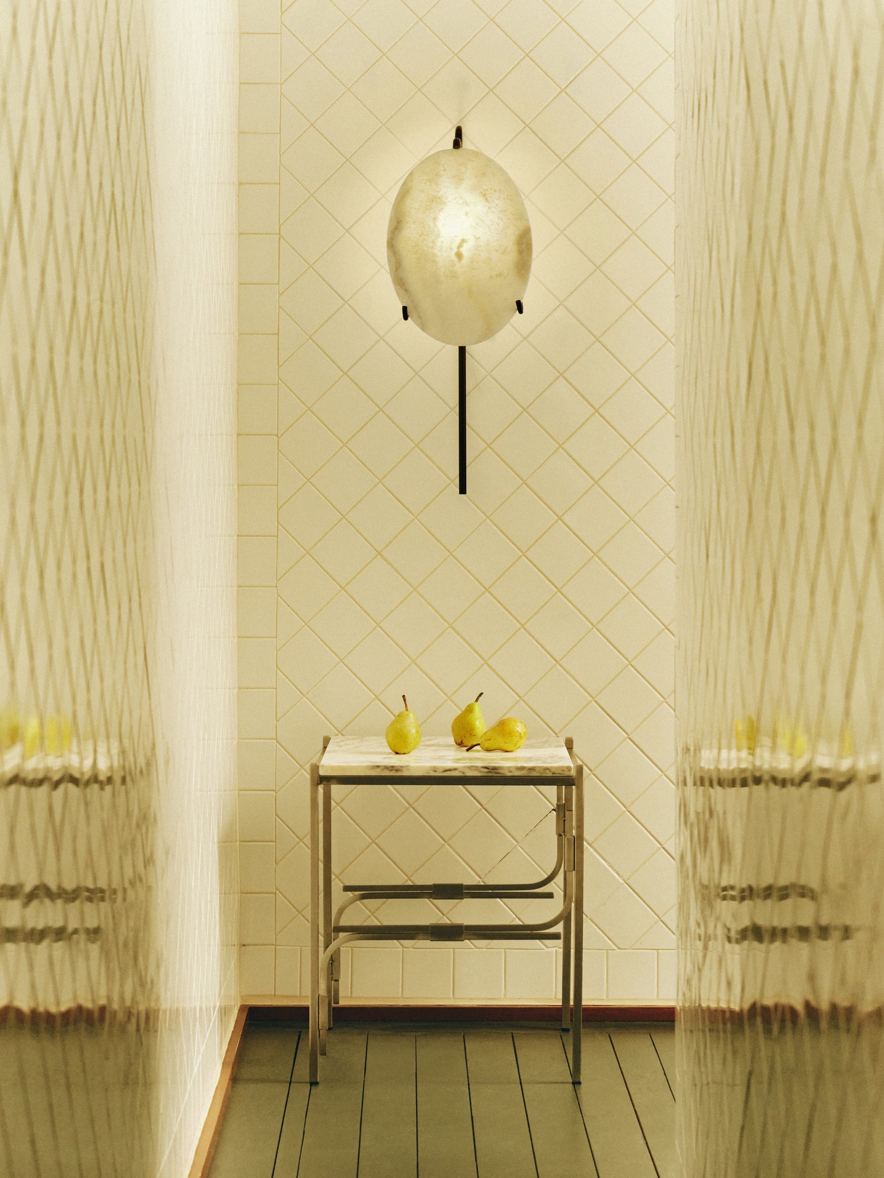 The Moon Lantern is a wall-mounted piece where oxidized brass frames a choice of milky glass or white onyx stone. gently backlit, it casts a soft, ambient glow - blurring the line between object and aura.