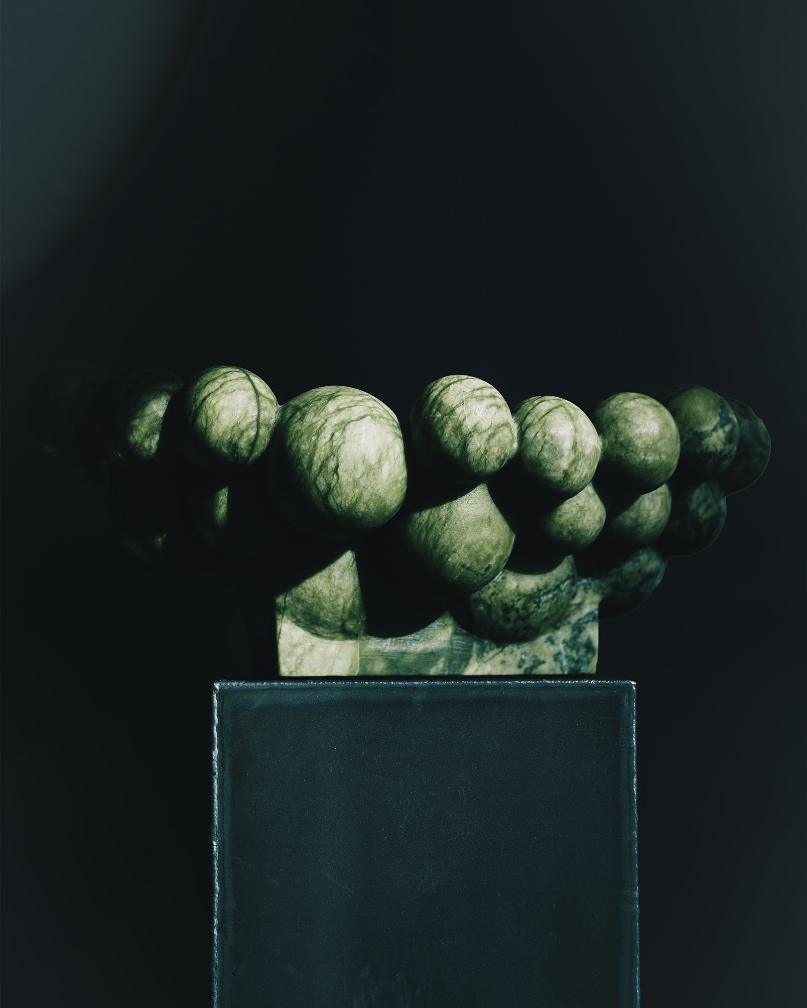Collecta Verde is a sculptural fruit object - a bowl or tray to gather vitality and bloom, composed of clustered spheres, hand-carved from richly veined green marble. The name, Collecta Verde (“green gathering”) speaks to the object’s dual nature - at once architectural and biological, structured and soft. The clustering form appears as if grown together rather than shaped - an accretion of smooth volumes evoking seeds, cells, or a botanical bloom.