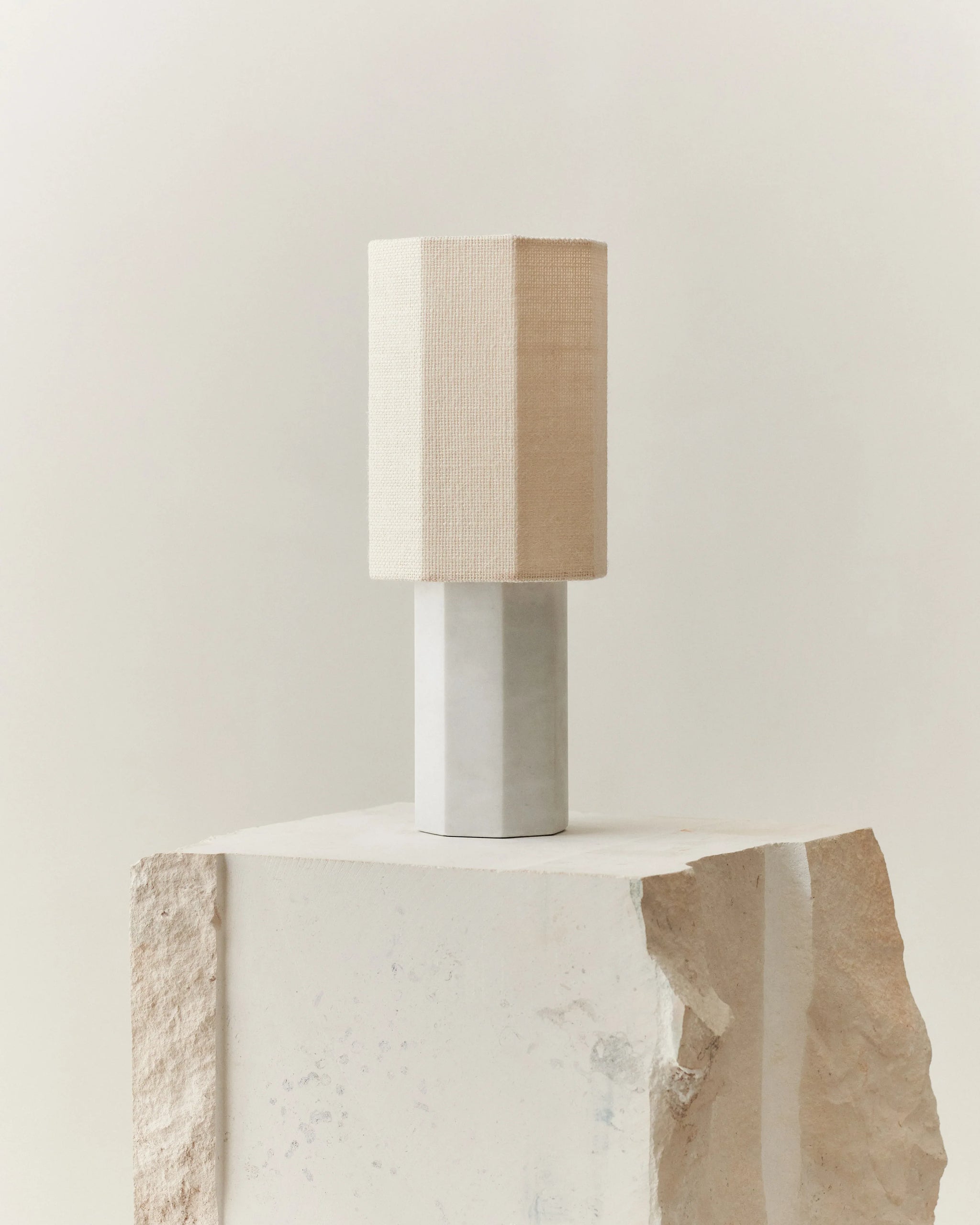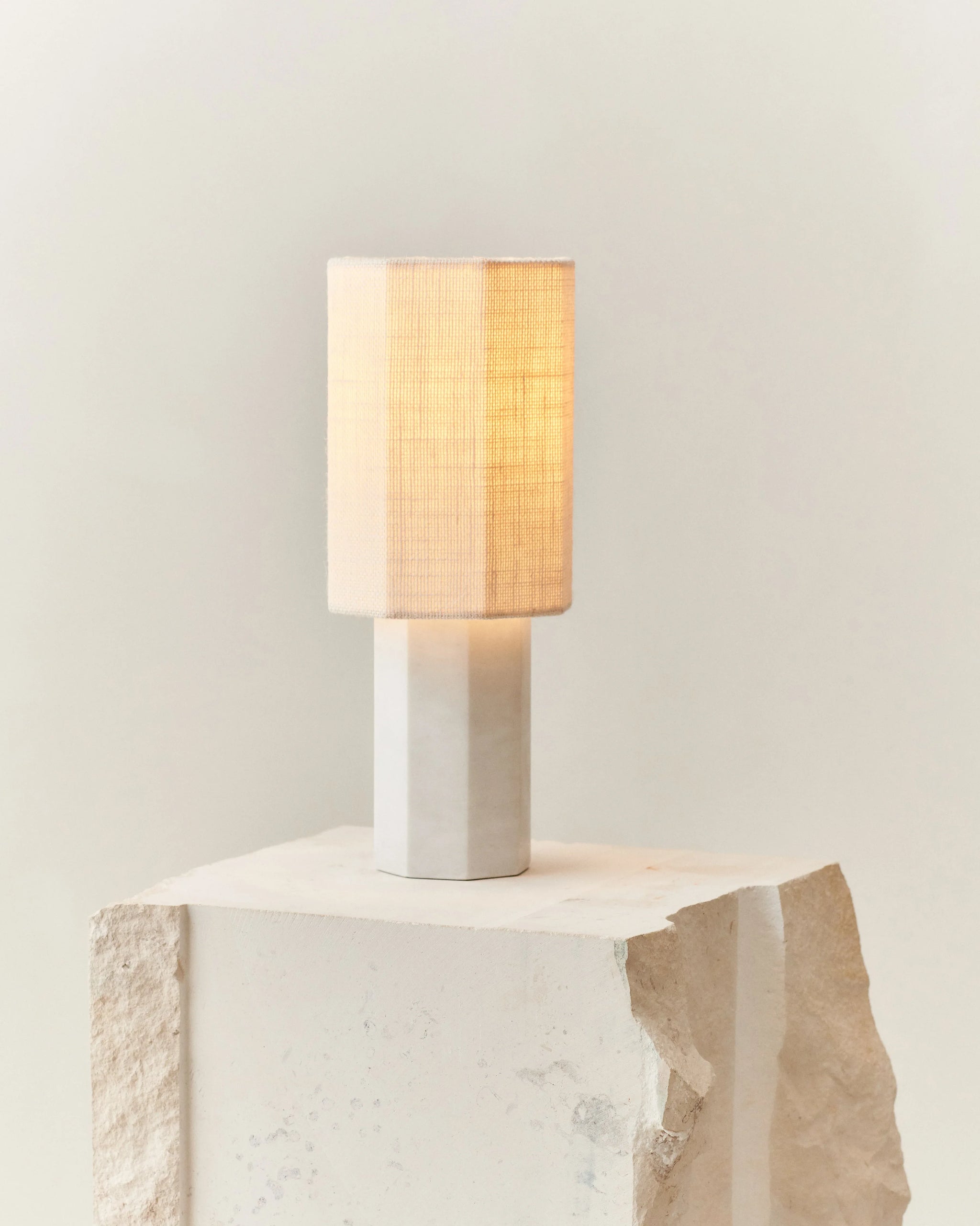 Gently luminous, Our Eight over Eight Lamp catches the eye from afar, highlighting its setting of placement. A truly customizable object, each base is carved from Italian marble or Travertine stone and is paired with a fine cotton lampshade. Choose your ideal combination and create a personalized expression.