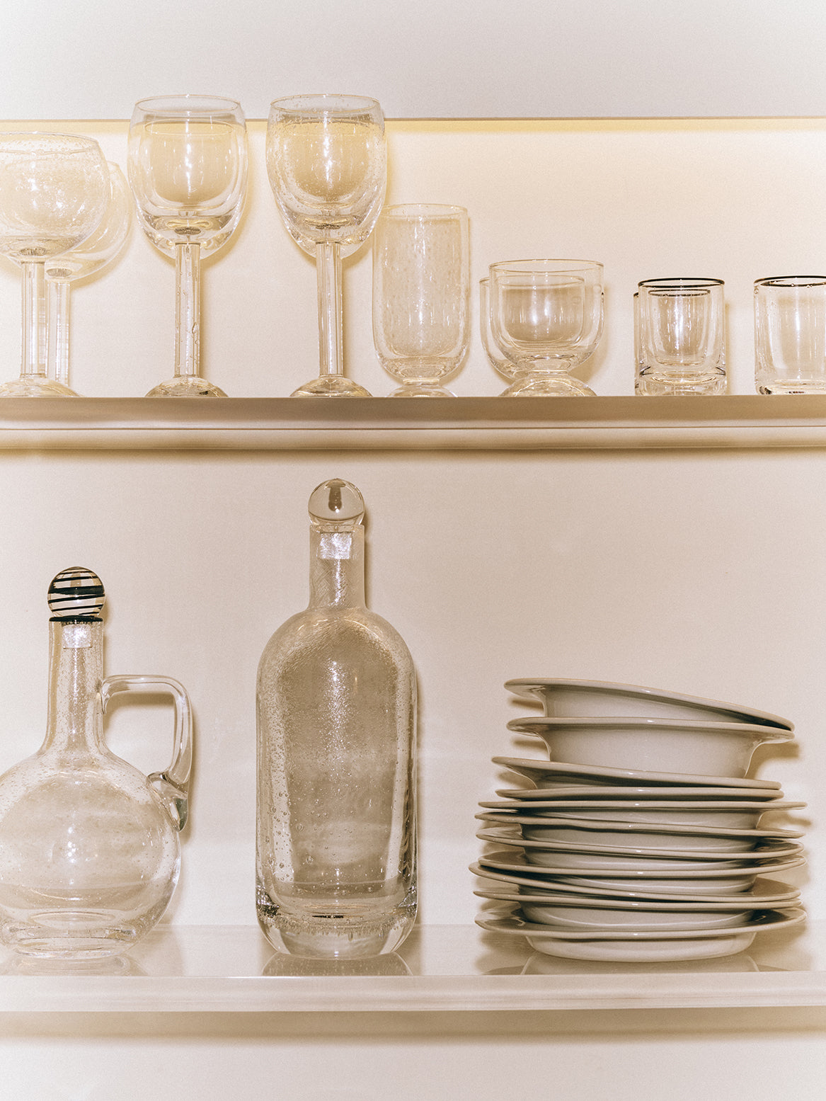 The array commemorates the craftsmanship of glass-blowing, which endows each object an individual character. Whilst this quality recurs in our collection, it is especially the case with this series and purposefully so.