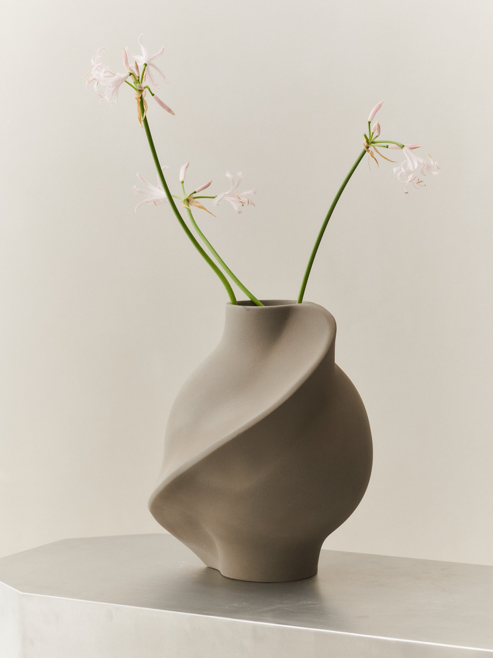 The Pirout Vase captivates with its organic lines and graceful form, making a striking statement whether standing alone or displaying a seasonal bloom. Its fluid, flowing silhouette evokes a sense of movement and elegance.