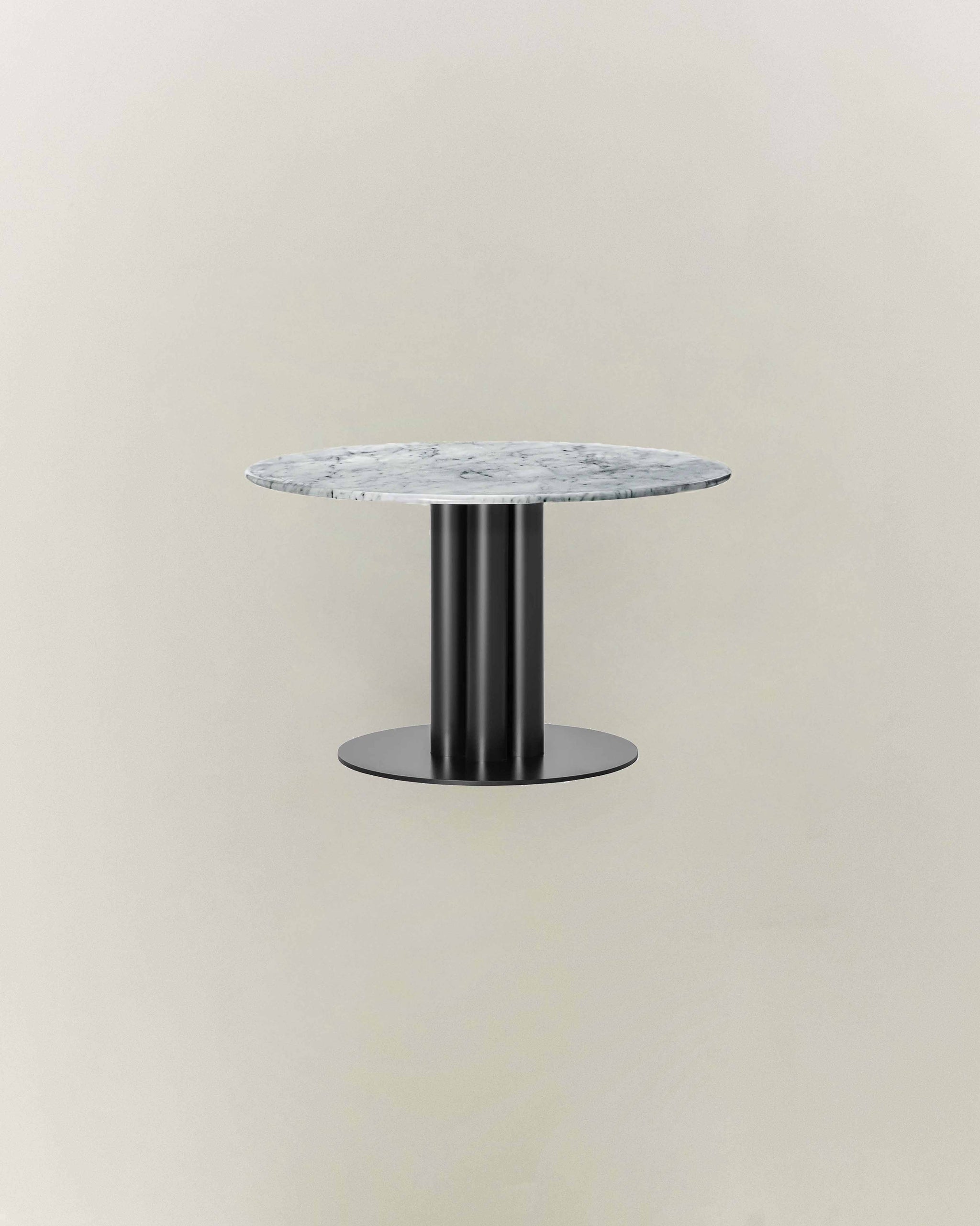 The Roundabout Coffee Table is available in three different kinds of Portuguese marble: White Carrara, Beige Moleanos and Grey Ruivina. The tabletop is placed on a black steel base.