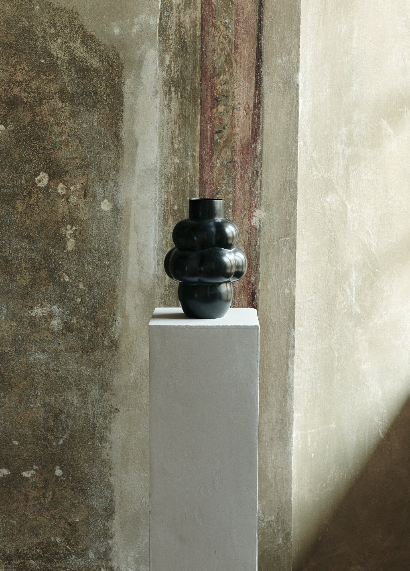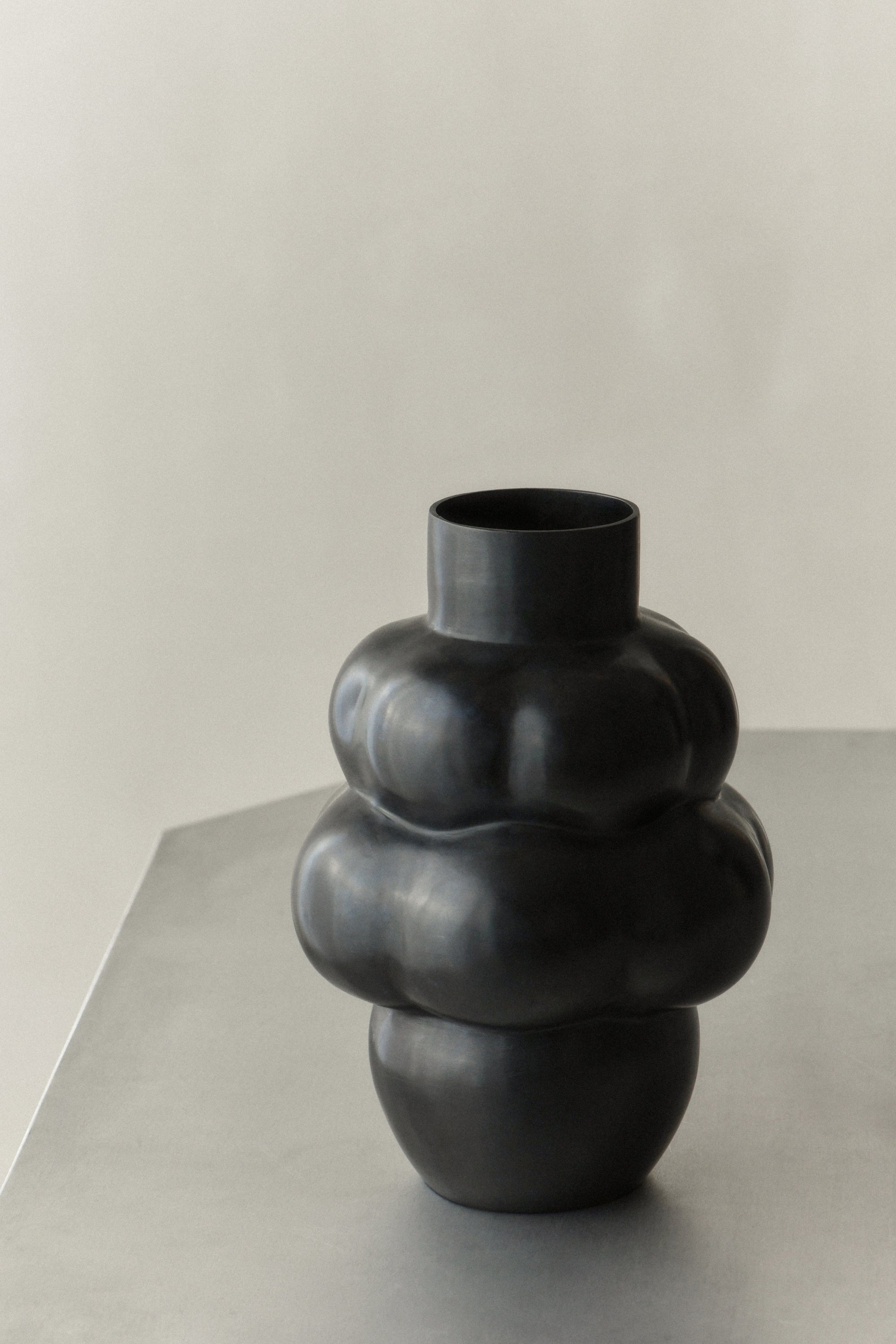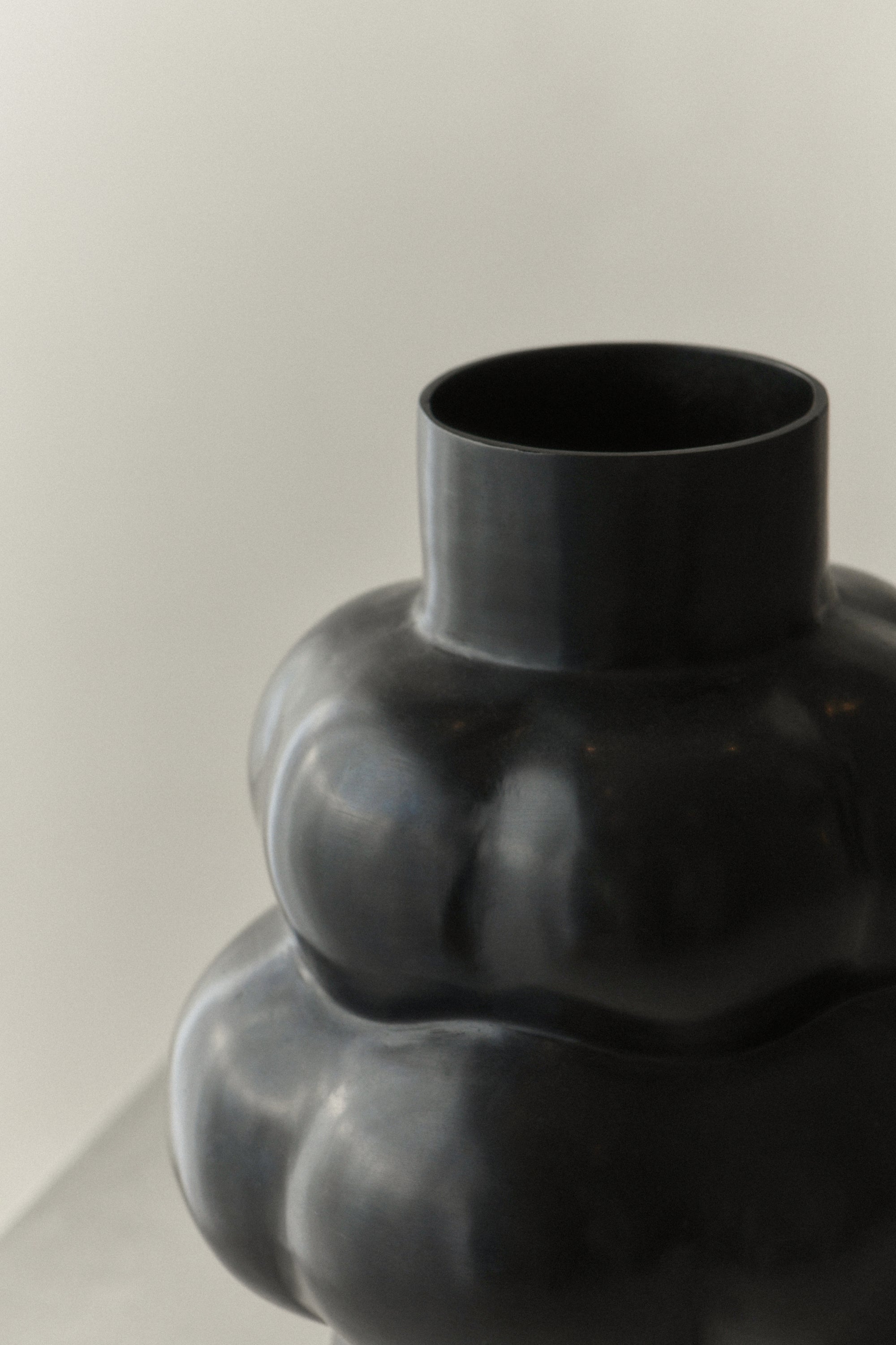 The BALLOON OBJECT 001 evokes a visual tension between softness and solidity, with its rounded, voluminous form juxtaposed against the rigid strength of oxidized black metal. This harmonious interplay between organic curves and industrial material creates a delicate balance, where the sculpture feels simultaneously weighty and buoyant.