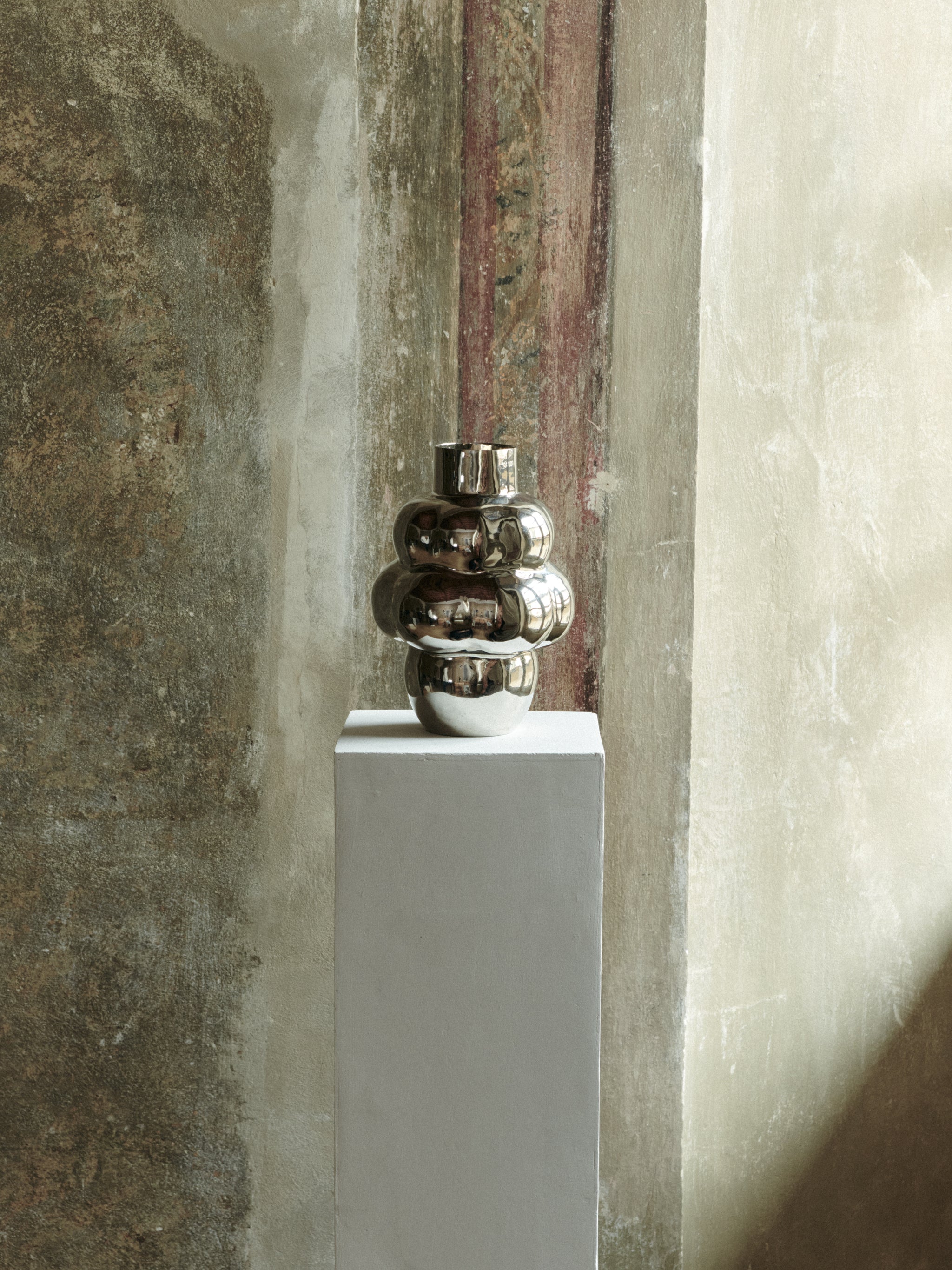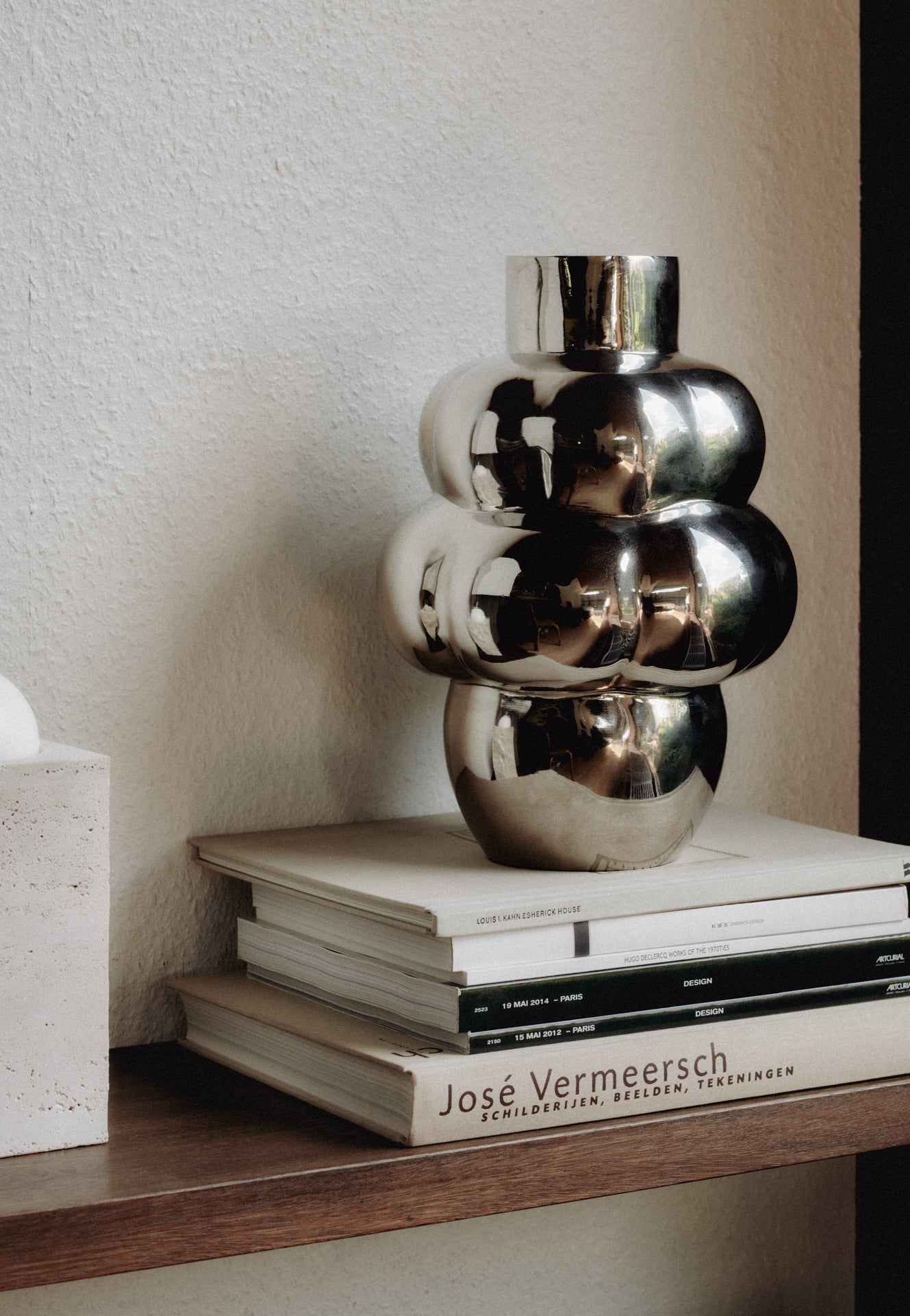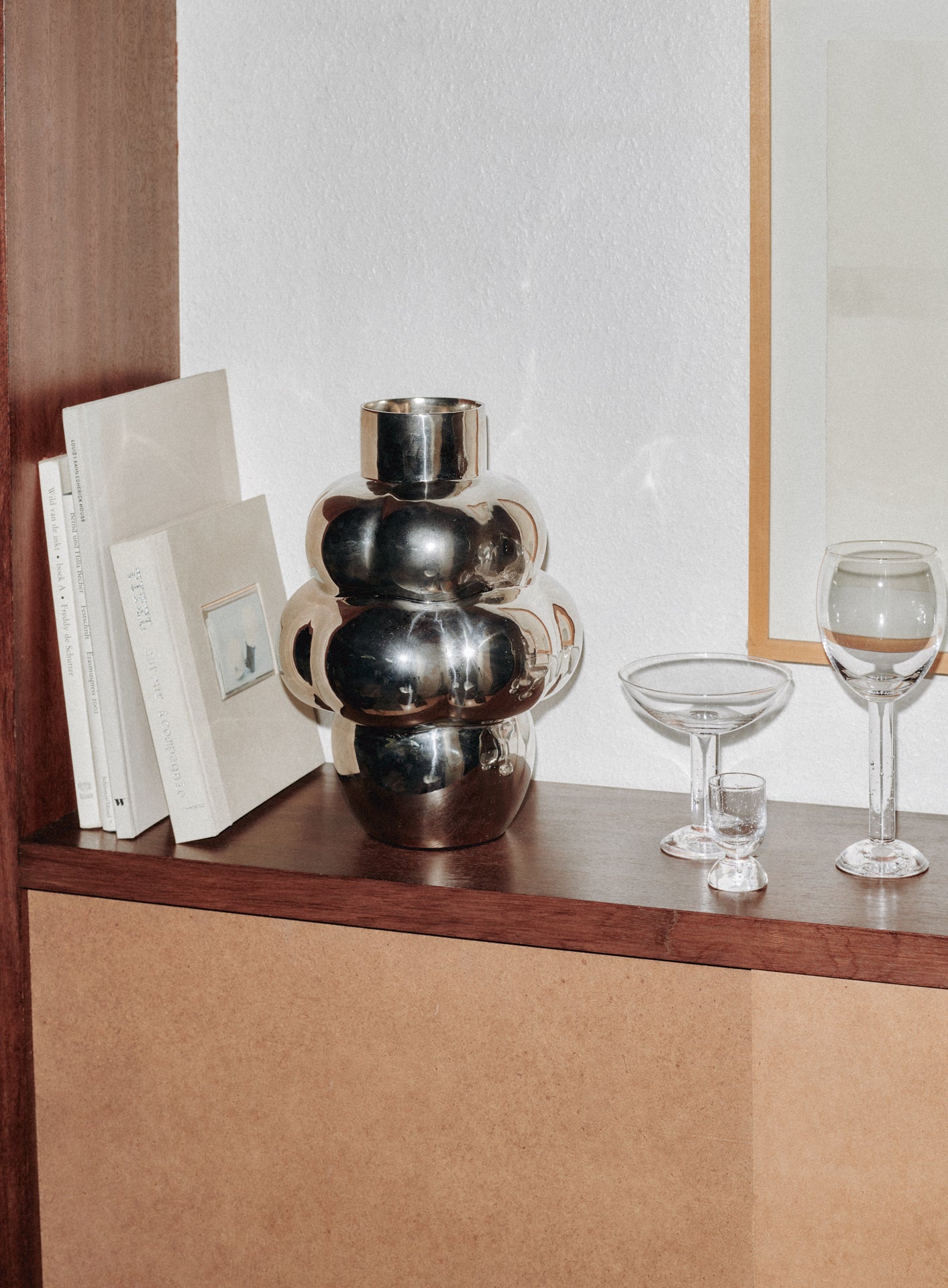 The BALLOON OBJECT 000 is a captivating exploration of fluidity and reflection. Its curvaceous form conveys an effortless sense of lightness, while the polished metal surface introduces a sleek, almost liquid brilliance. This reflective quality allows the object to interact dynamically with its surroundings, continuously evolving as it captures and distorts light and space.