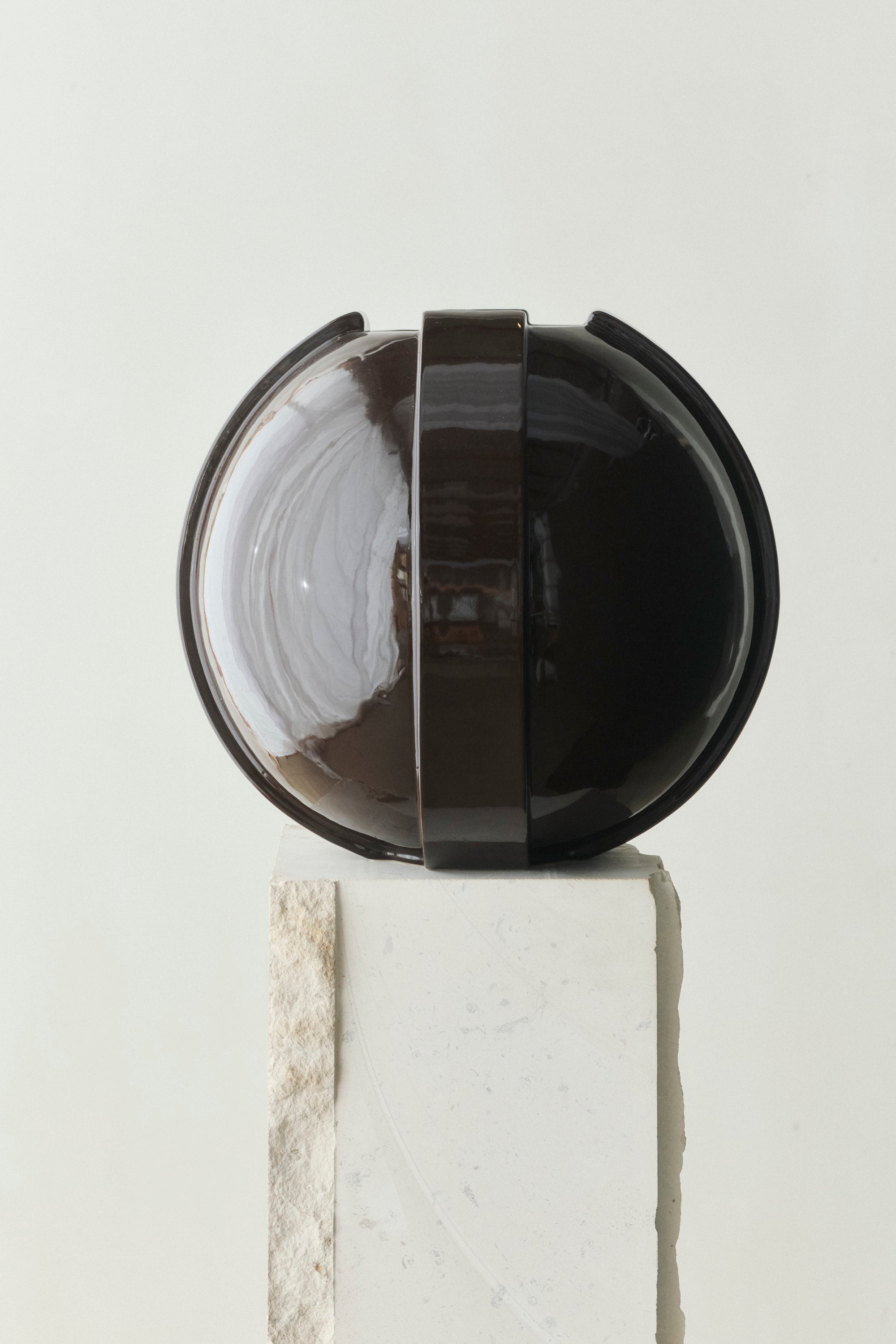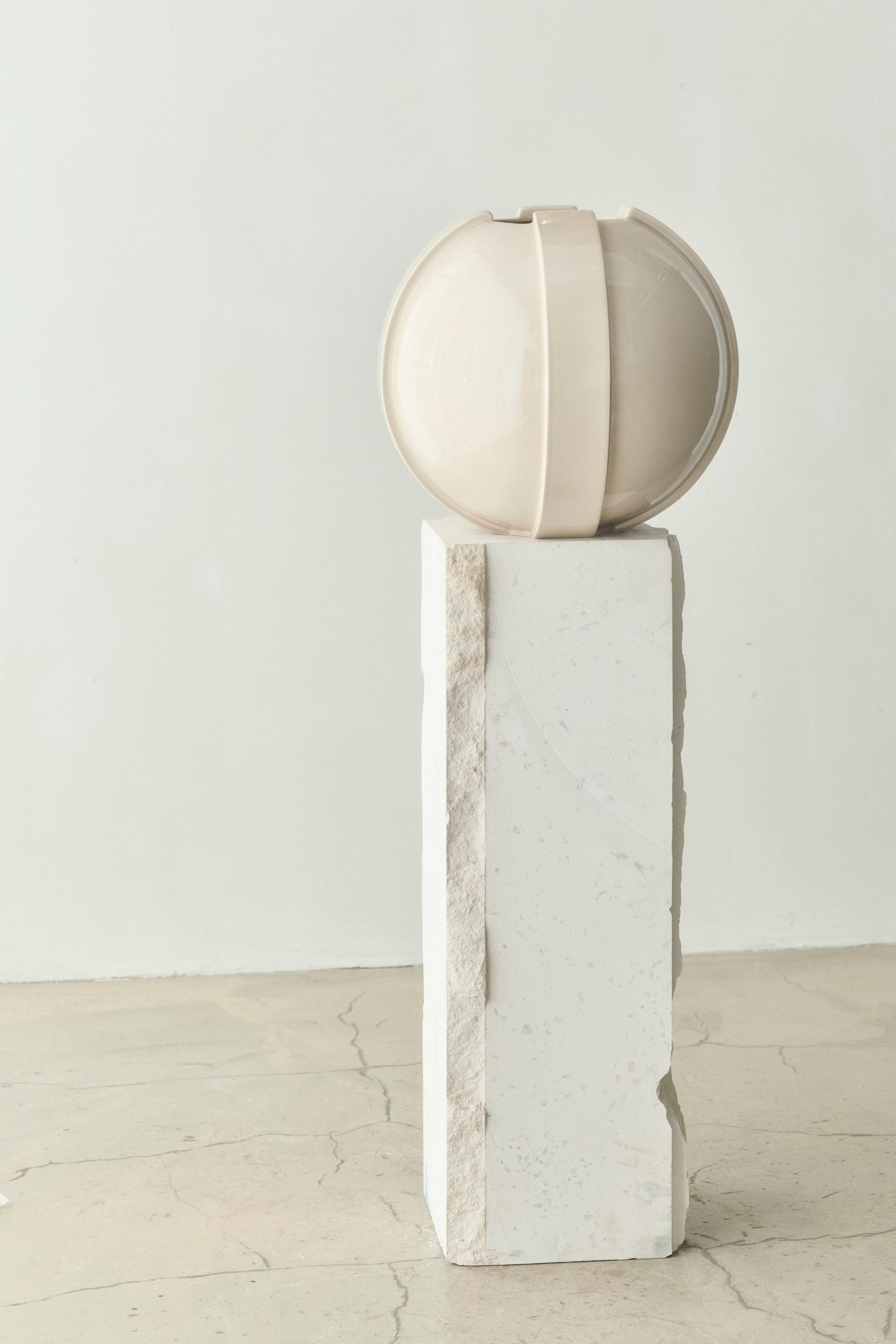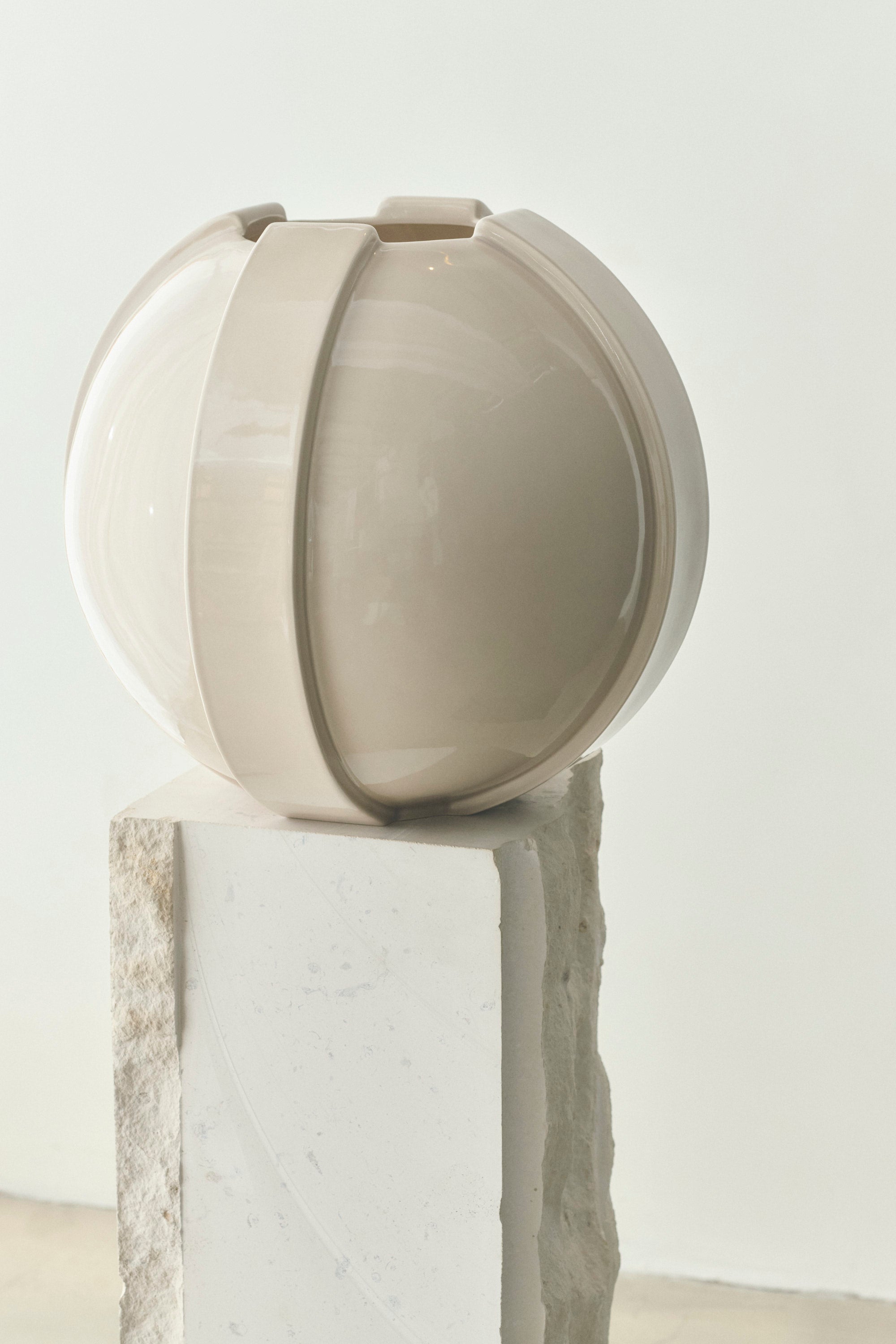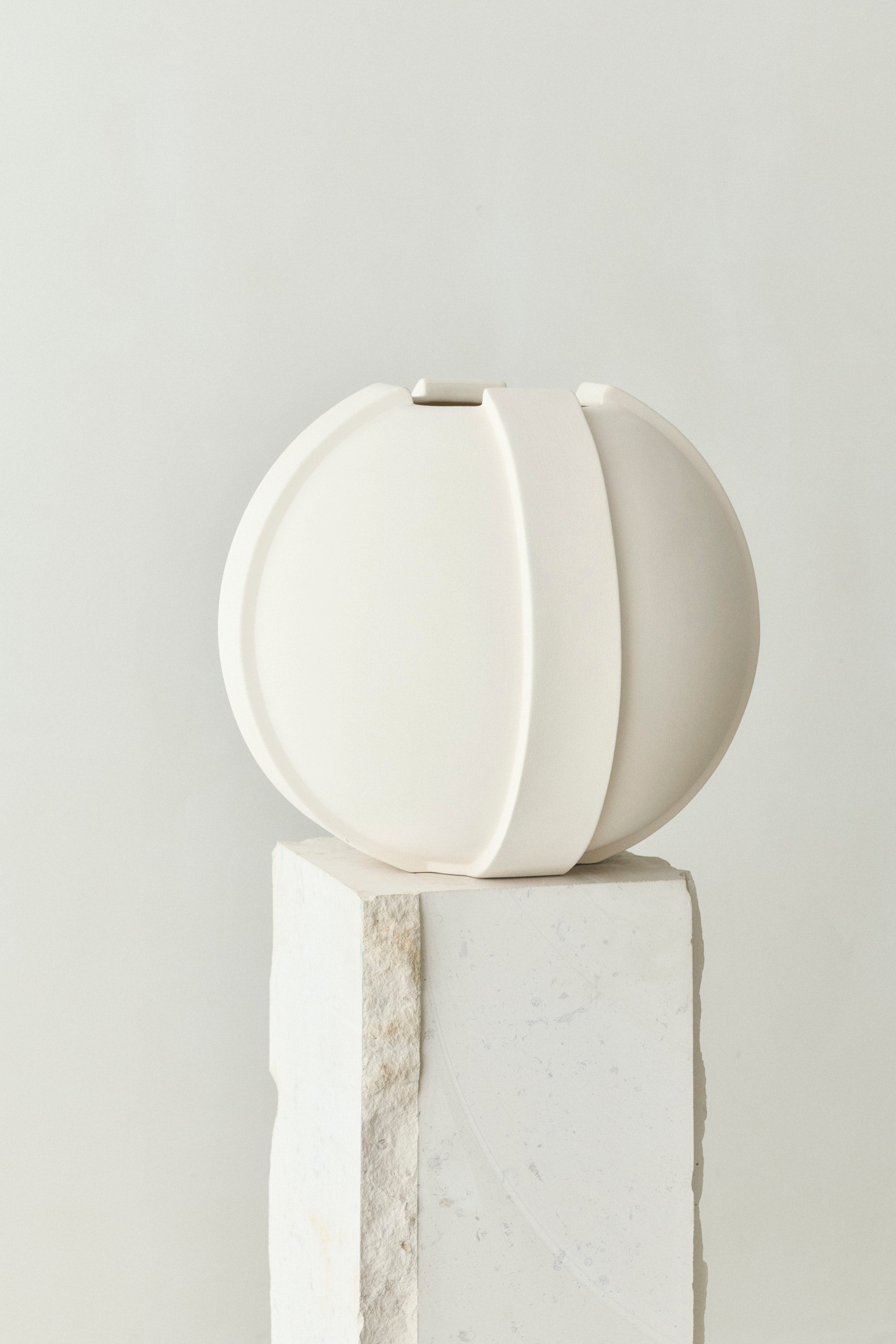 The VINCI Vase displays a round silhouette, accented by a belt-like band encircling its figure - a visual detail that metaphorically channels circular energy. Artisanally hand-molded in Portugal, it comes in two sizes. The larger impression is a grande sculpture, standing independently.